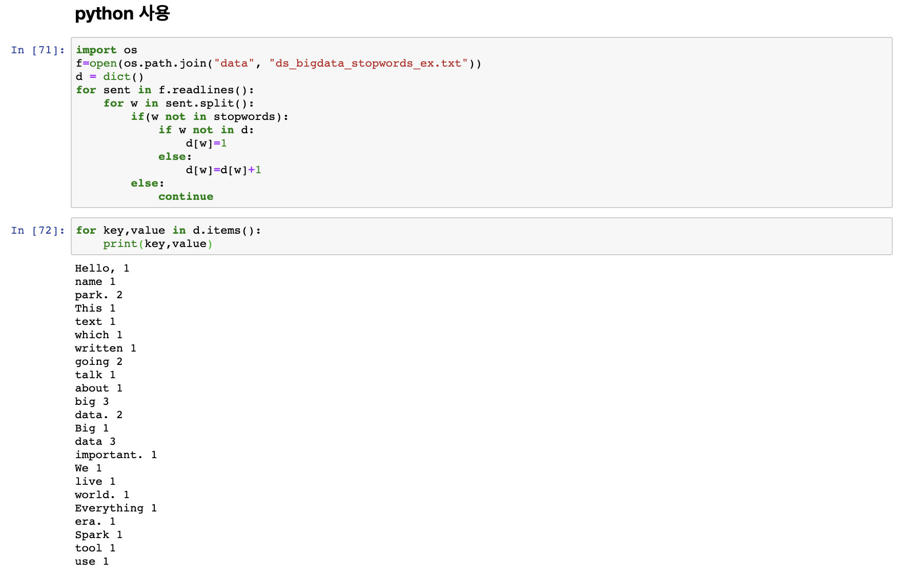 위 ds_bigdata_stopwords_ex.txt 예제에 나오는 문장을 예제로 word count를 해보도록 하자.