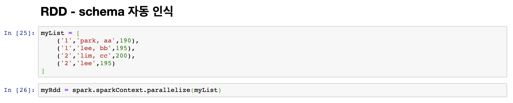 RDD는 schema가 정해지 않은 비구조적 데이터이다. 따라서 schema를 따로 정의하지 않으면 schema를 유추해서 dataframe을 생성한다.