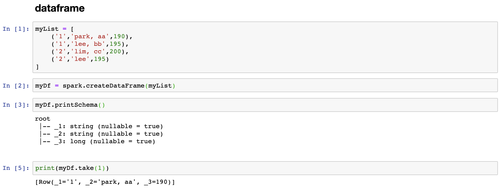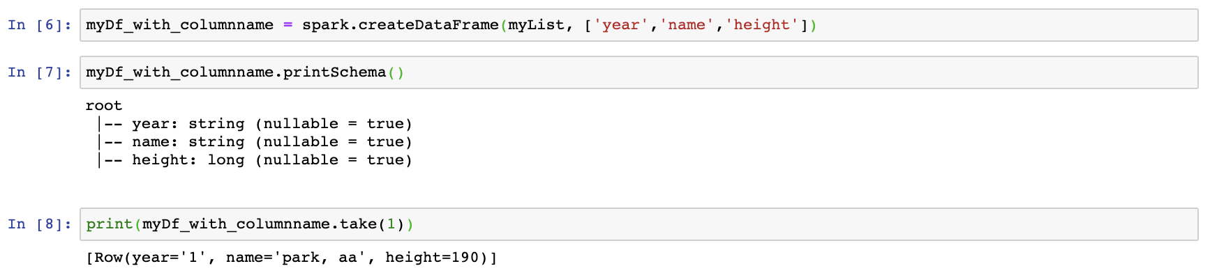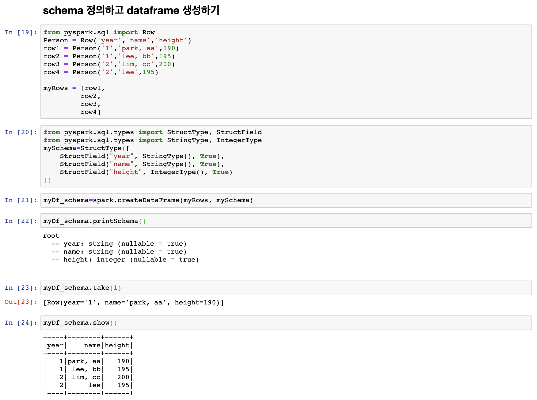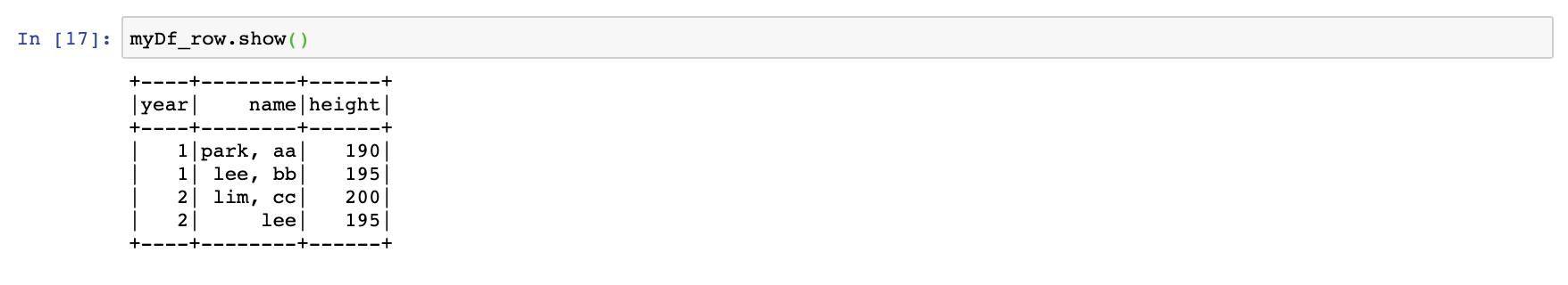 이후 생성해 놓은 myRows 와 mySchema를 이용해서 dataframe을 생성한 것을 확인 할 수 있다.