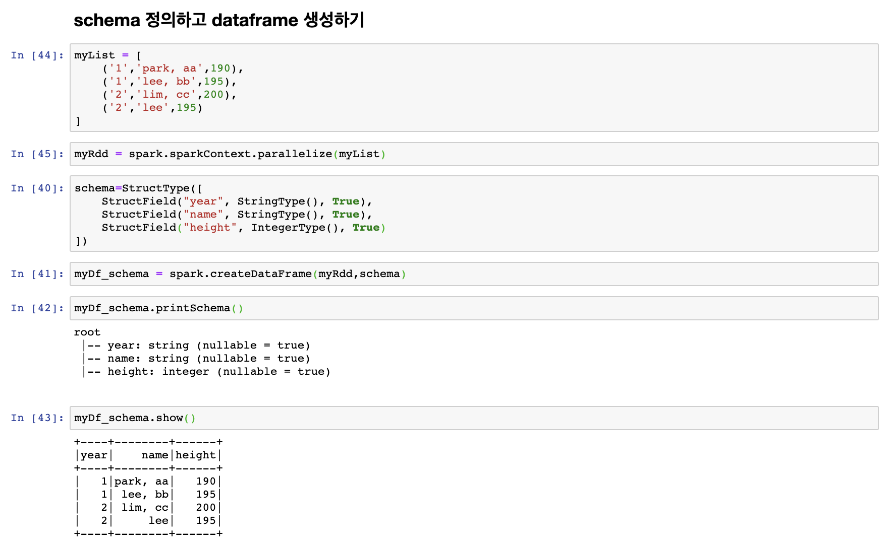 다음과 같이 RDD를 생성하고 schema를 정의한 후 dataframe 생성하는 것도 가능한 것을 확인 할 수 있다.