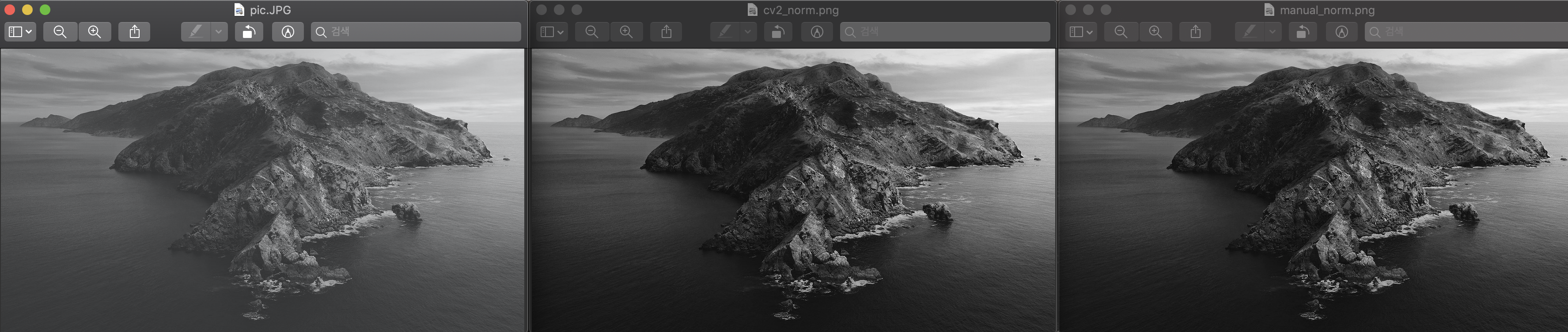 원본 이미지 파일을 읽은 다음 제가 직접 정규화를 해보고, cv2.normalize() 함수를 이용하여 정규화하고 이를 히스토그램으로 시각화까지 해보았습니다. 그래프 상으로는 많이 티가 나지 않지만 자세히 보면 픽셀값 50 정도에 편중되어 있던 그래프가 조금씩 퍼져 있는 것을 확인 할 수 있습니다.