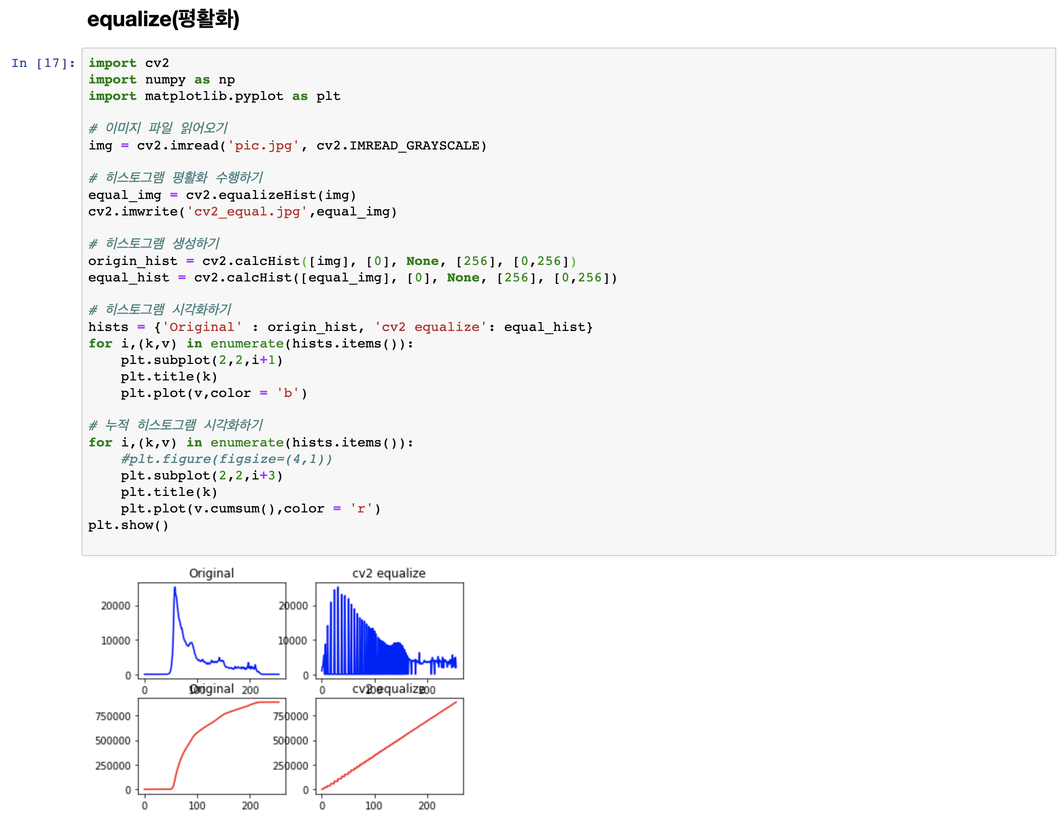 이미지를 읽어온 이후 cv2.equalizeHist() 함수를 이용해 히스토그램을 평활하 시켜 준 이후 원본 이미지와 평활화된 이미지의 히스토그램과 누적 히스토그램을 생성한 이후 시각화 시켜준 모습입니다.