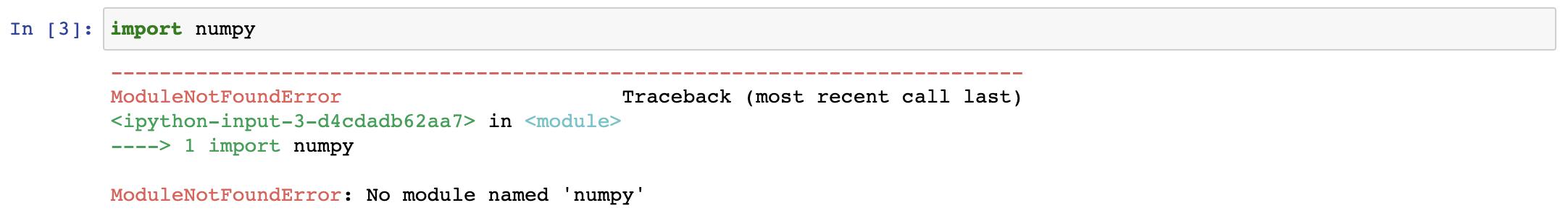 Jupyter Notebook을 맨처음에 사용하다 보면 python의 경로 혹은 다른 문제 때문에 아래 사진처럼 분면 pip를 통해서 install 했음에도 python shell에서는 import 할수 있음에도 불구하고 설치한 모듈(ex) pandas, tensorflow)들을 Jupyter에서는 import 하지 못하고 No module named 'module' 이라는 ModuleNotFoundError이 발생할 때가 있다.