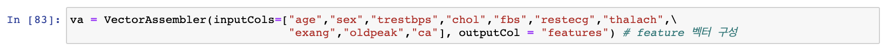target1, testOrtrain column을 제외하고 나머지 column들을 VectorAssembler를 통해 Feature Vector를 생성해 주도록 하겠습니다.